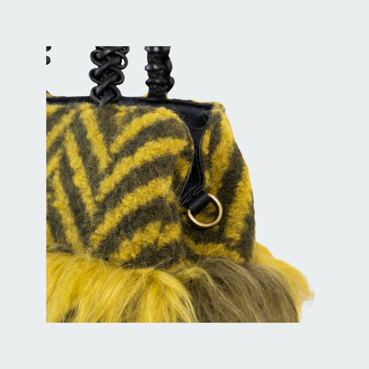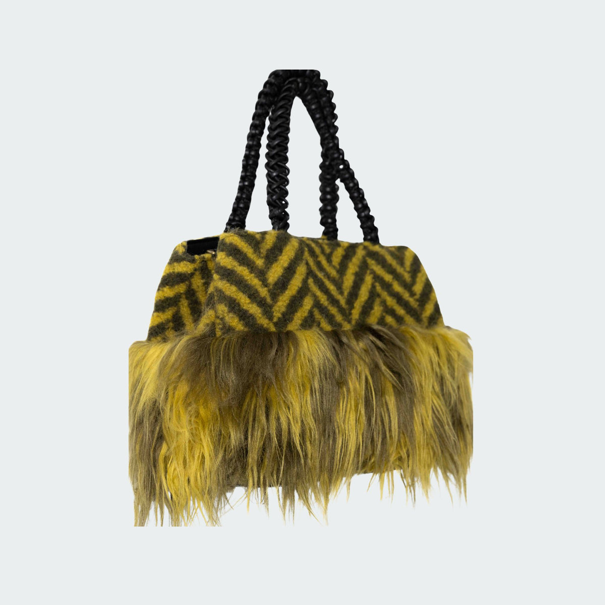 Realizzata con un mix di eco-pelliccia a pelo lungo nel vibrante colore verde acido e un tessuto superiore con un'accattivante fantasia geometrica nei toni del giallo/marrone e nero, è l'accessorio perfetto per chi ama distinguersi. I manici intrecciati neri aggiungono un dettaglio sofisticato e strutturato.