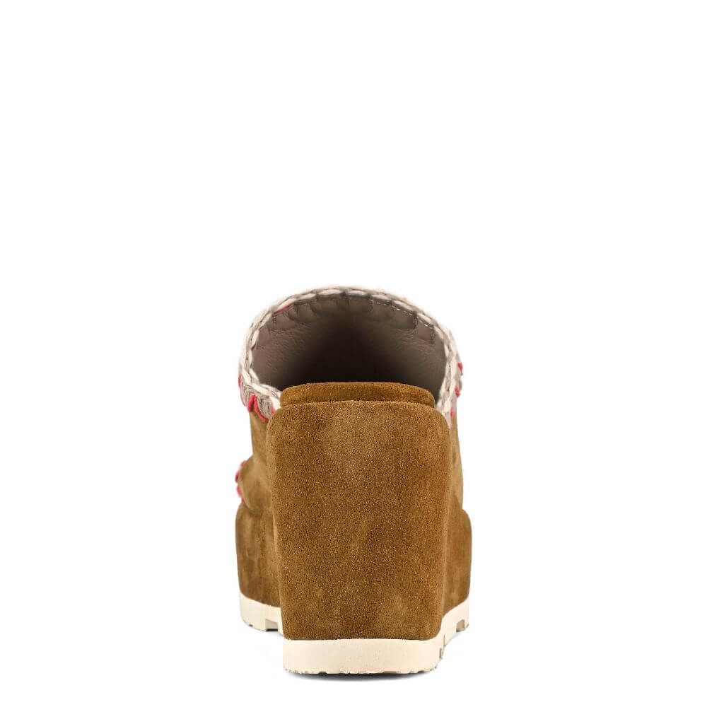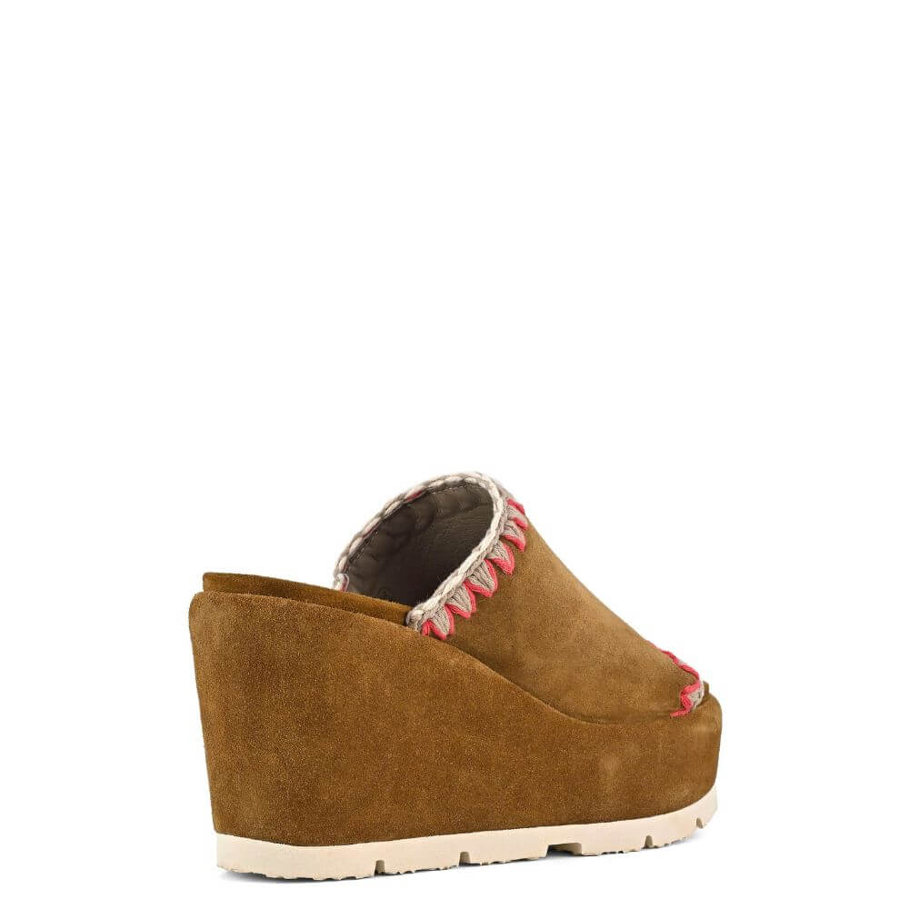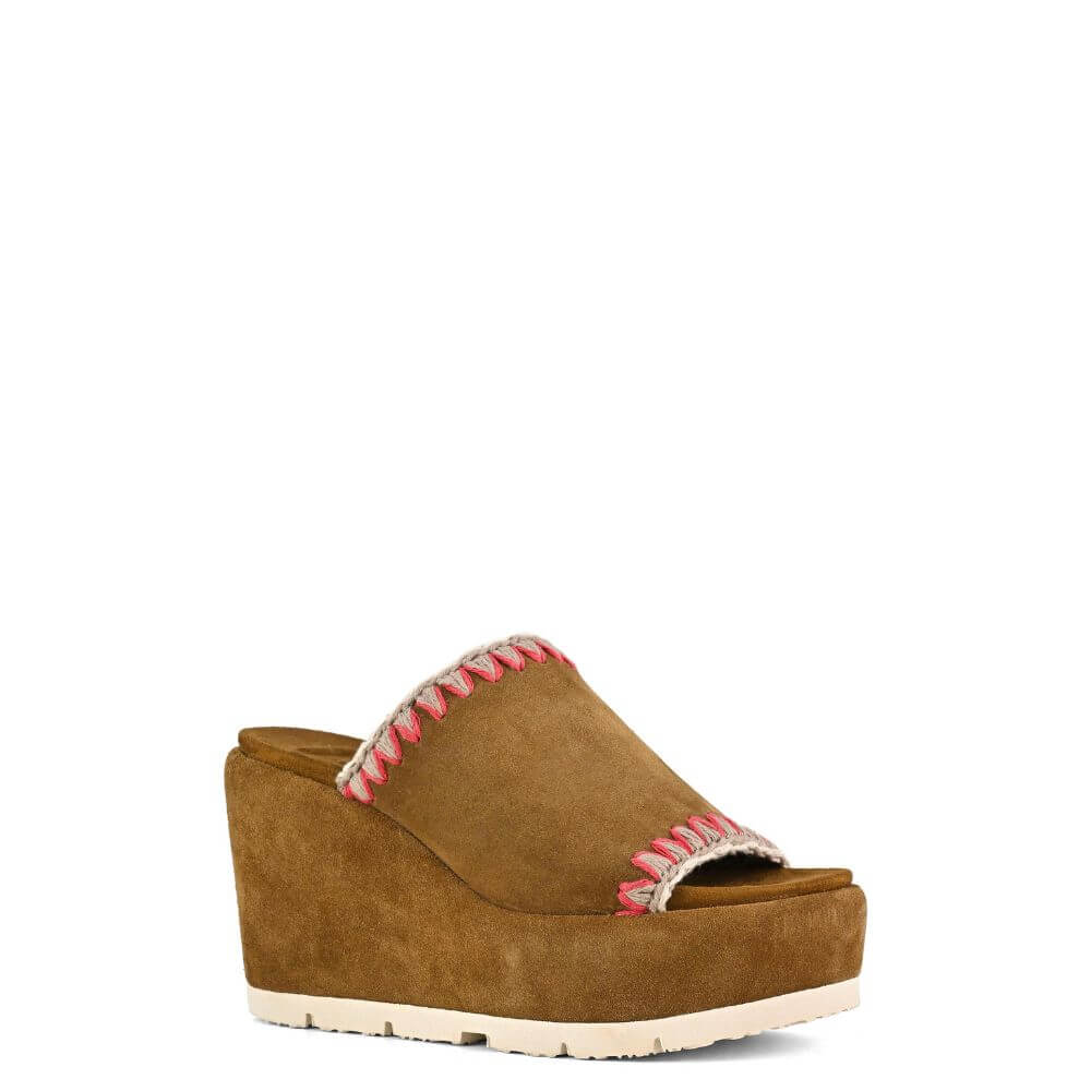 Sandalo donna Mou con zeppa e platform in morbido camoscio marrone. La fascia avvolgente presenta eleganti inserti in corda beige e fucsia, che donano un tocco di colore e originalità. Perfetto per chi cerca comfort e stile in un unico modello.