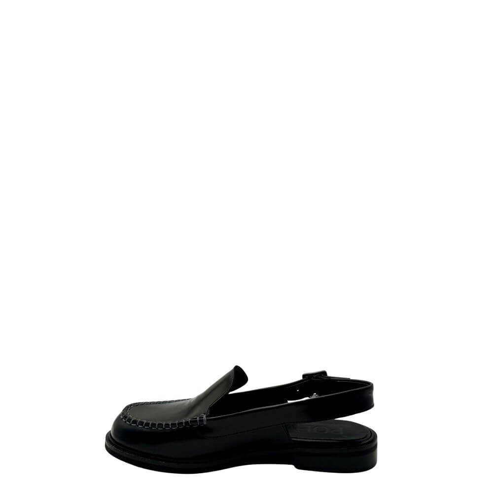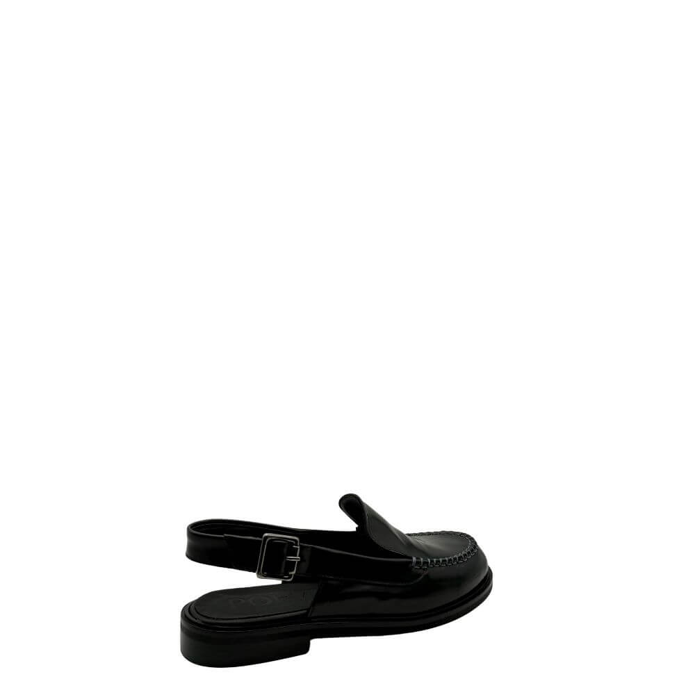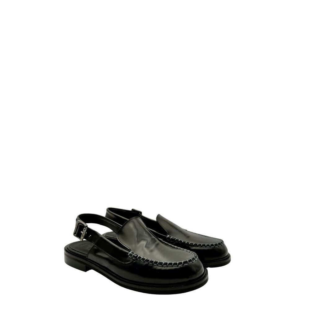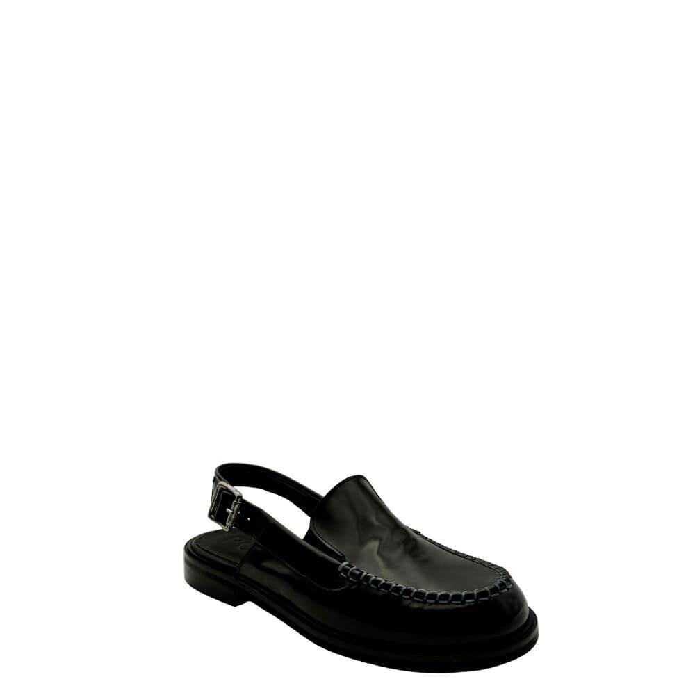 Questa scarpa nera è una sabot elegante con allacciatura cinturino laterale, perfetta per la donna raffinata e alla moda. Comoda e chic, si adatta a ogni occasione della p/e 2025.