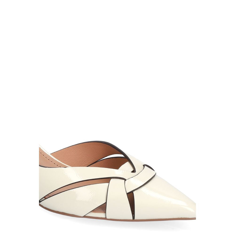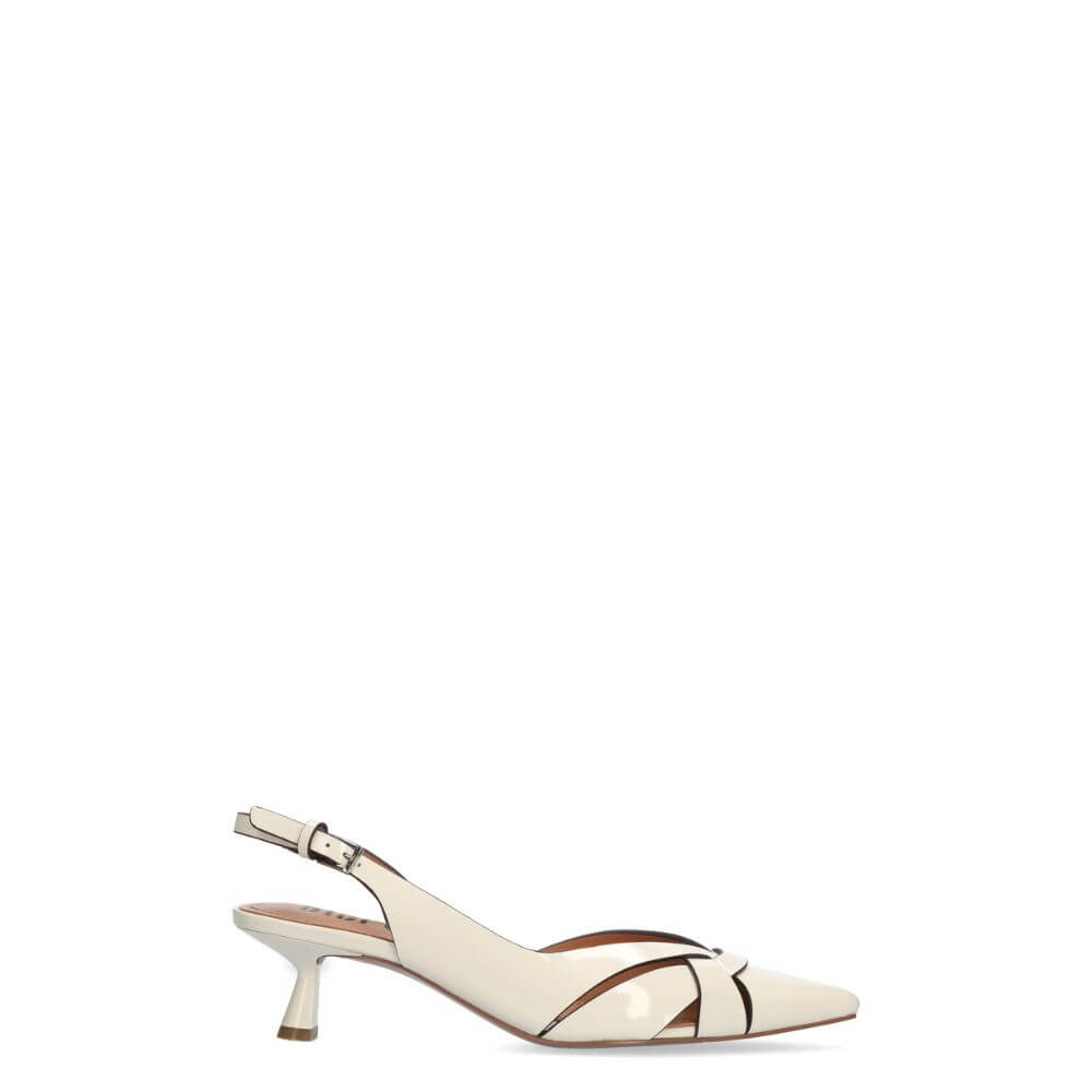 Sandalo chiuso in punta aperto dietro in pelle di vernice , modello con punta affusolata e tacco a spillo da cm 4.5. Disponibile nel beige e marrone