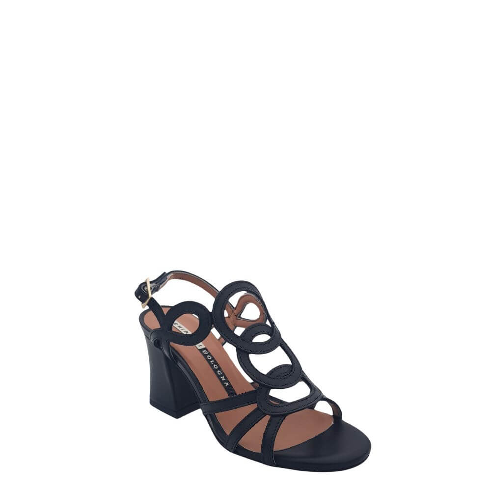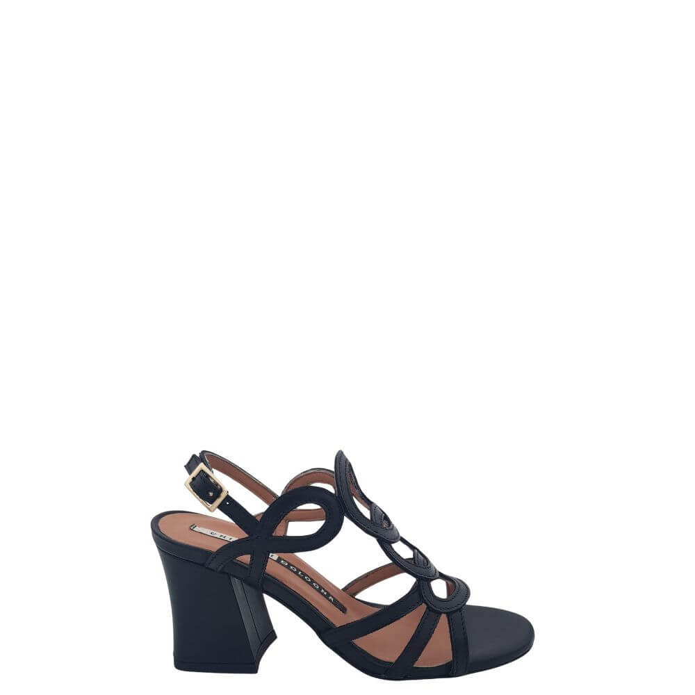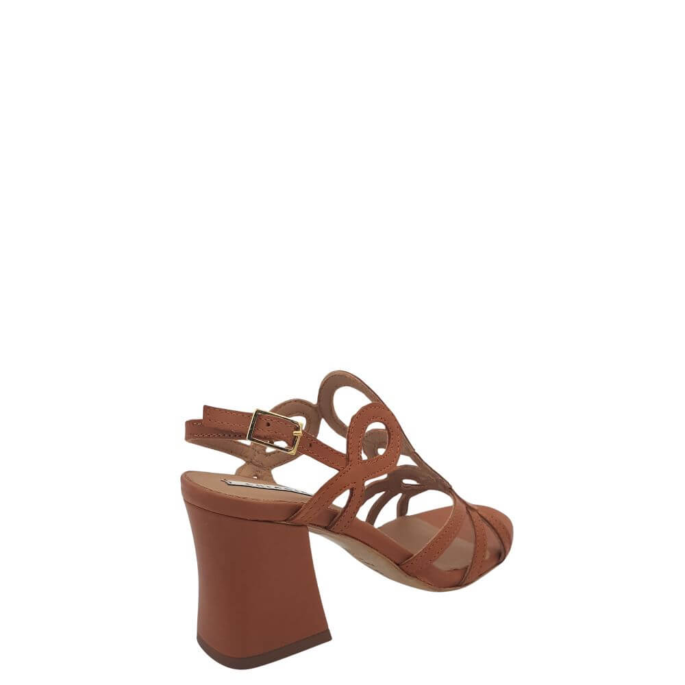 Sandalo donna in pelle con tacco largo di cm 7 un disegno particolare e raffinato sul collo del piede allacciatura in caviglia . disponibile in due varianti colore : nero e cuoio .