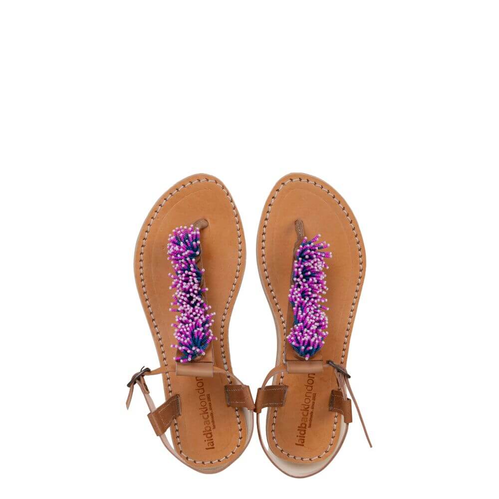 Sandalo con infradito donna flat in cuoio con applicazione di perline fucsia e azzurro a cascata sul collo del piede, cinturino in caviglia, fondo antiscivolo, divertente con un tocco di vivacità per i tuoi look estivi.