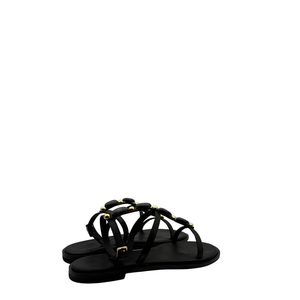 Sandalo elegante e sofisticato con caviglia allacciata per una calzata perfetta. Pietre e borchie dorate aggiungono un tocco di raffinatezza al sandalo nero. Perfetto per completare un look da sera o per un'occasione speciale.