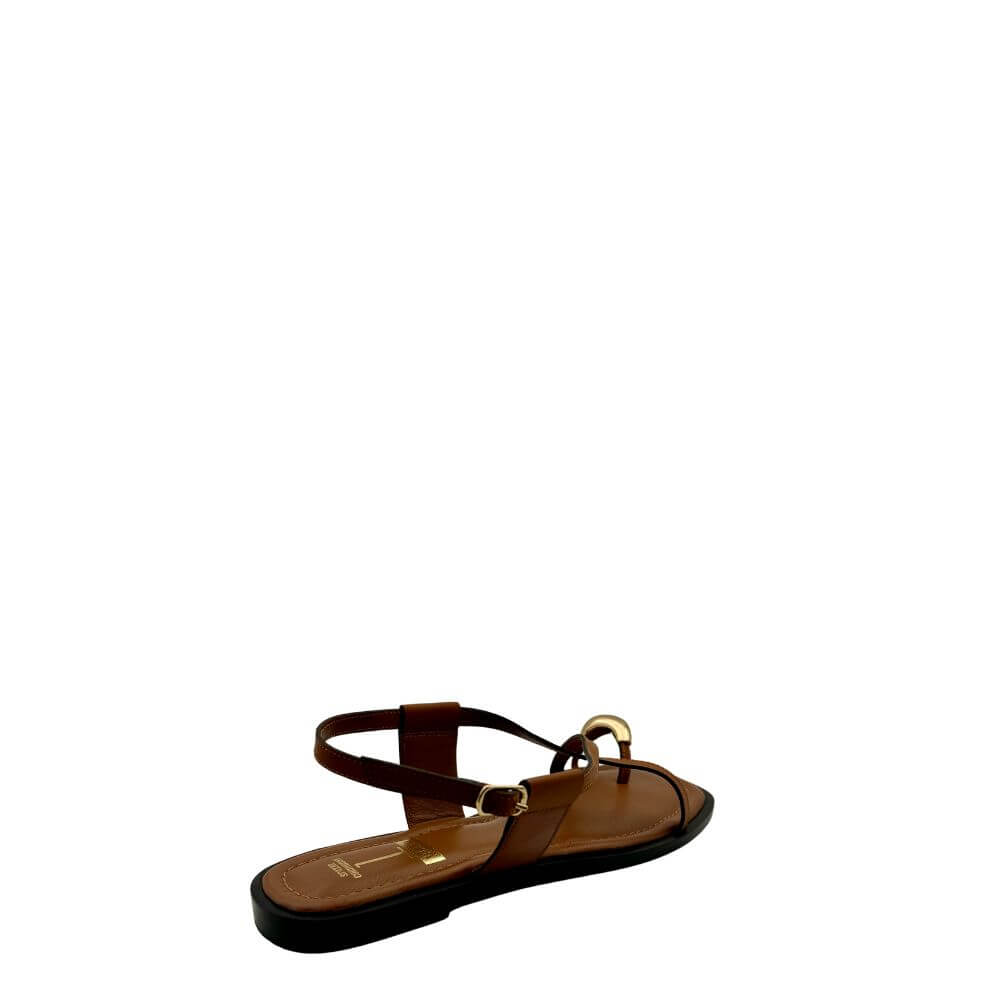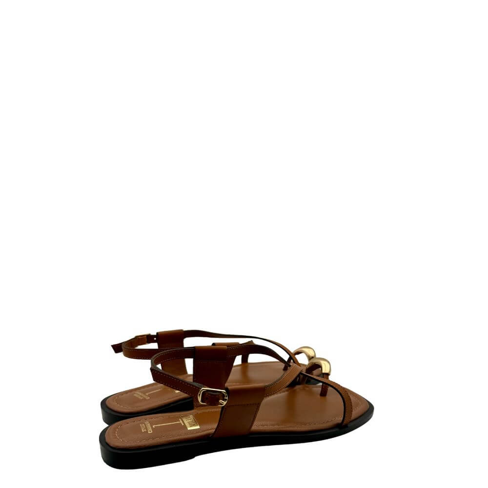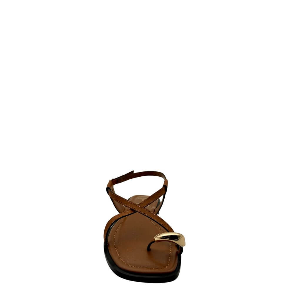 Realizzato in morbida ecopelle color marrone caldo, questo modello minimal conquista con il dettaglio glamour dell’anello dorato sull’alluce.
