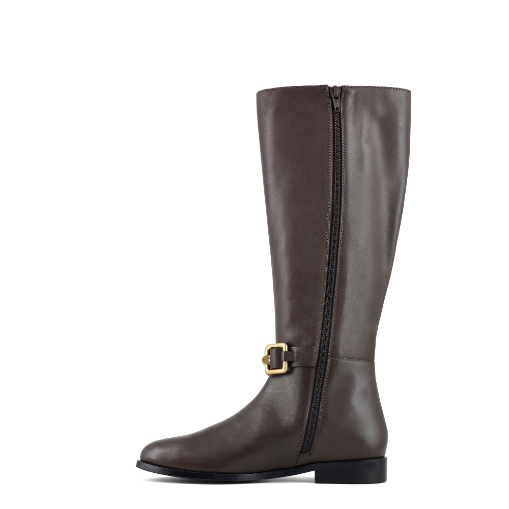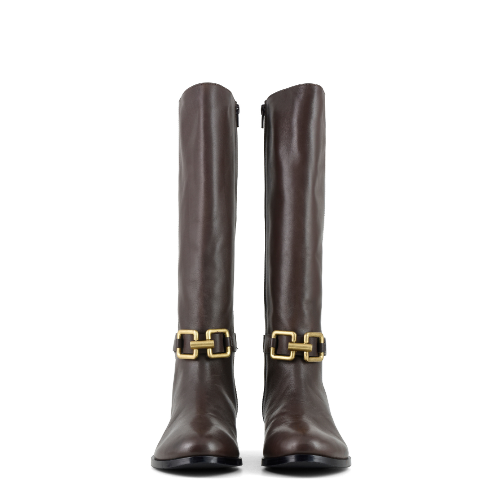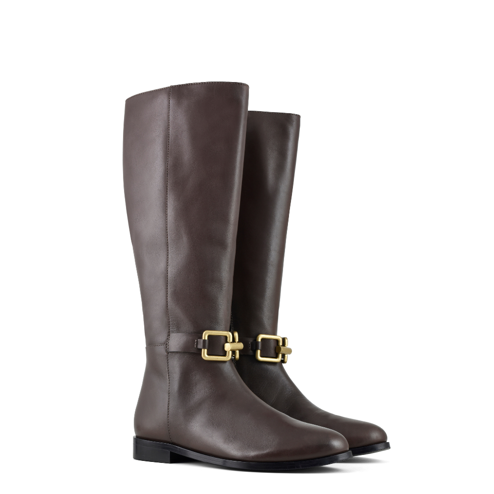 Un ritorno allo stivale alto al ginocchio in pelle morbidissima rifinito con un fine morsetto dorato dona alla donna che lo indossa una femminilità unica . Lo stivale cavallerizzo adatto a tutto l'abbigliamento che sceglierai, ideale con un outfit di lana e fantasia scozzese