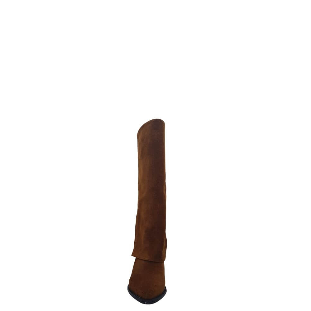 Stile western rivisitato! Stivale alto in morbido suede cuoio con spacco frontale, punta affusolata e tacco geometrico. Perfetto per look casual-chic autunnali. Aggiungi un tocco di carattere al tuo outfit!"