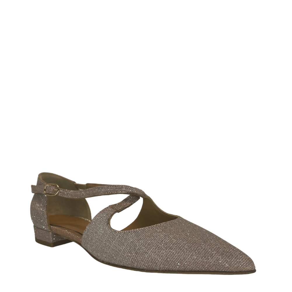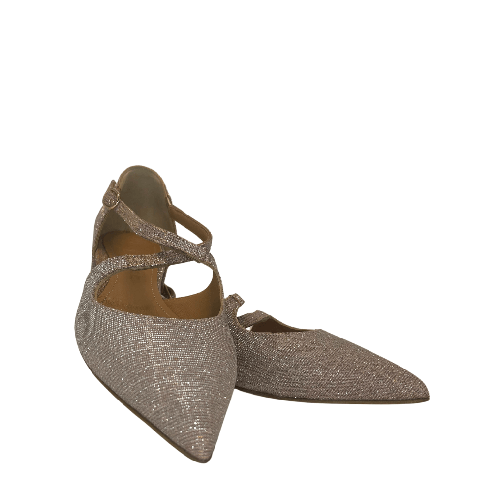 Ballerina a punta realizzata in tessuto glitter tendente al rosa con cinturino regolabile con fibbia., aperta lateralmente e chiusa nel tallone. E' un prodotto made in Italy ed è foderata all'interno in pelle. Il tacco è di circa due cm e la suola è in cuoio antiscivolo. La sua semplicità e la sua raffinatezza riesce a rifinire il tuo outfit in ogni occasione.