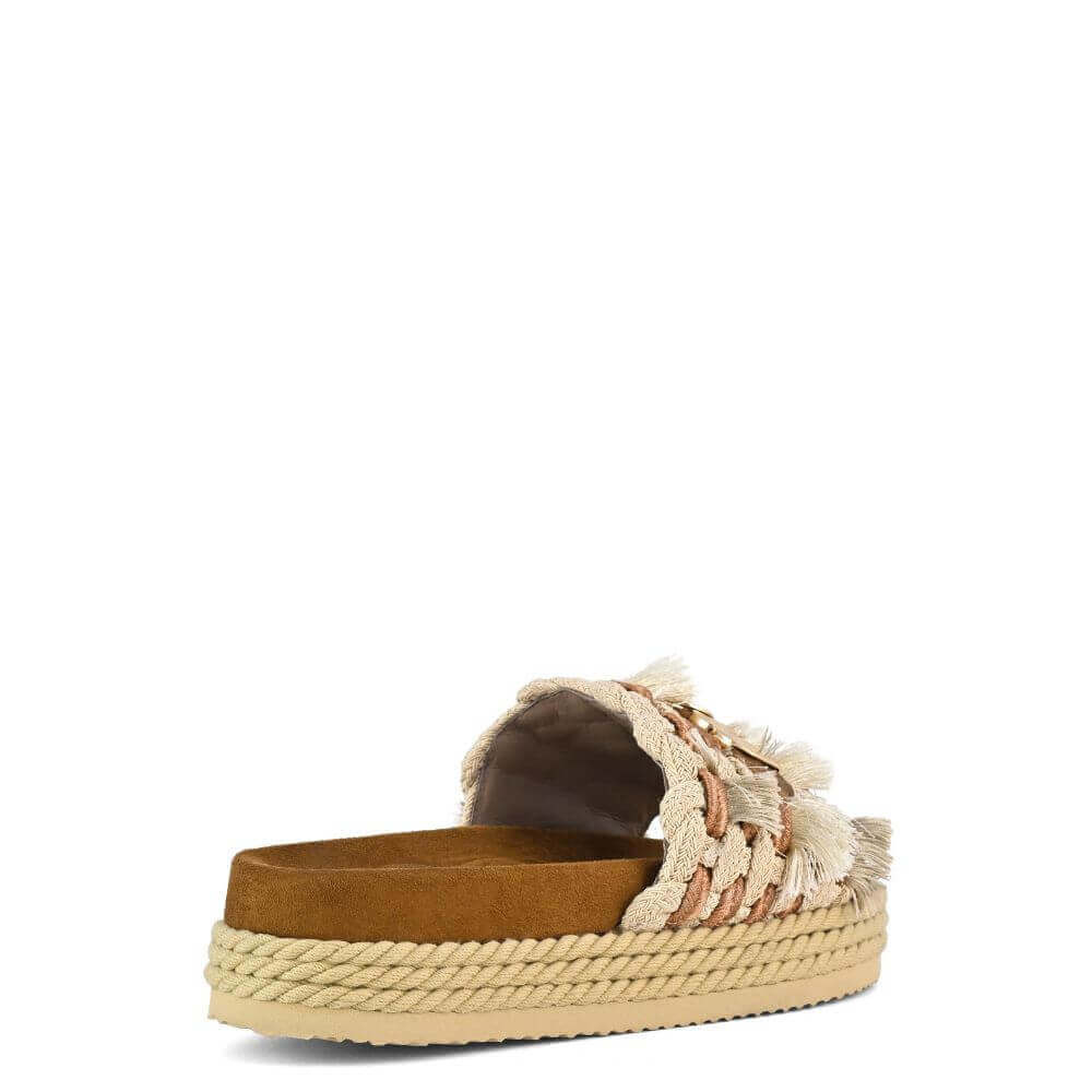 Questa ciabatta donna beige Mou unisce stile e comfort grazie al fondo in corda e alla fascia intrecciata impreziosita dal logo in metallo bronzo. Il plantare anatomico garantisce una calzata confortevole per tutto il giorno, ideale per chi cerca eleganza e praticità nella stagione primavera/estate 2025.