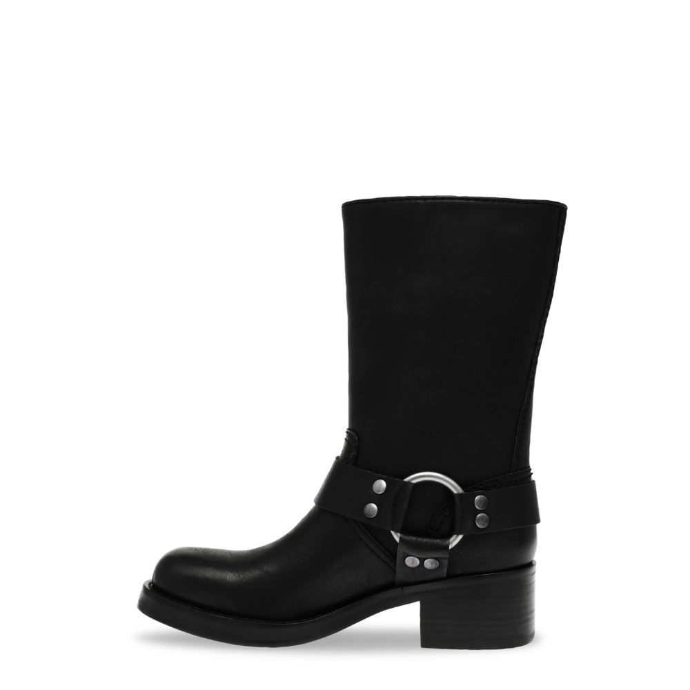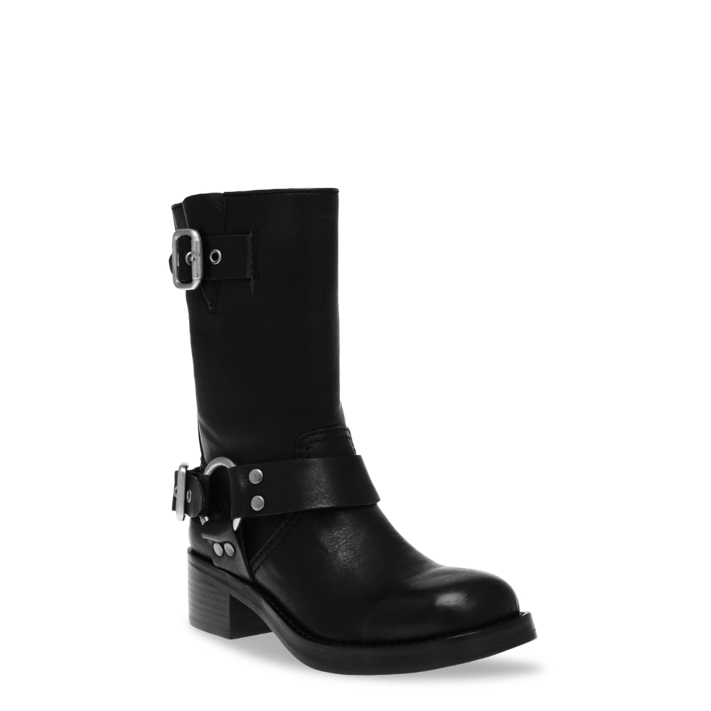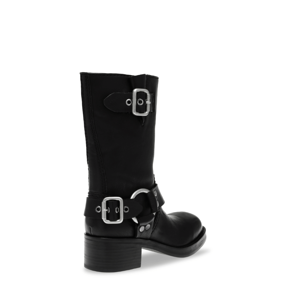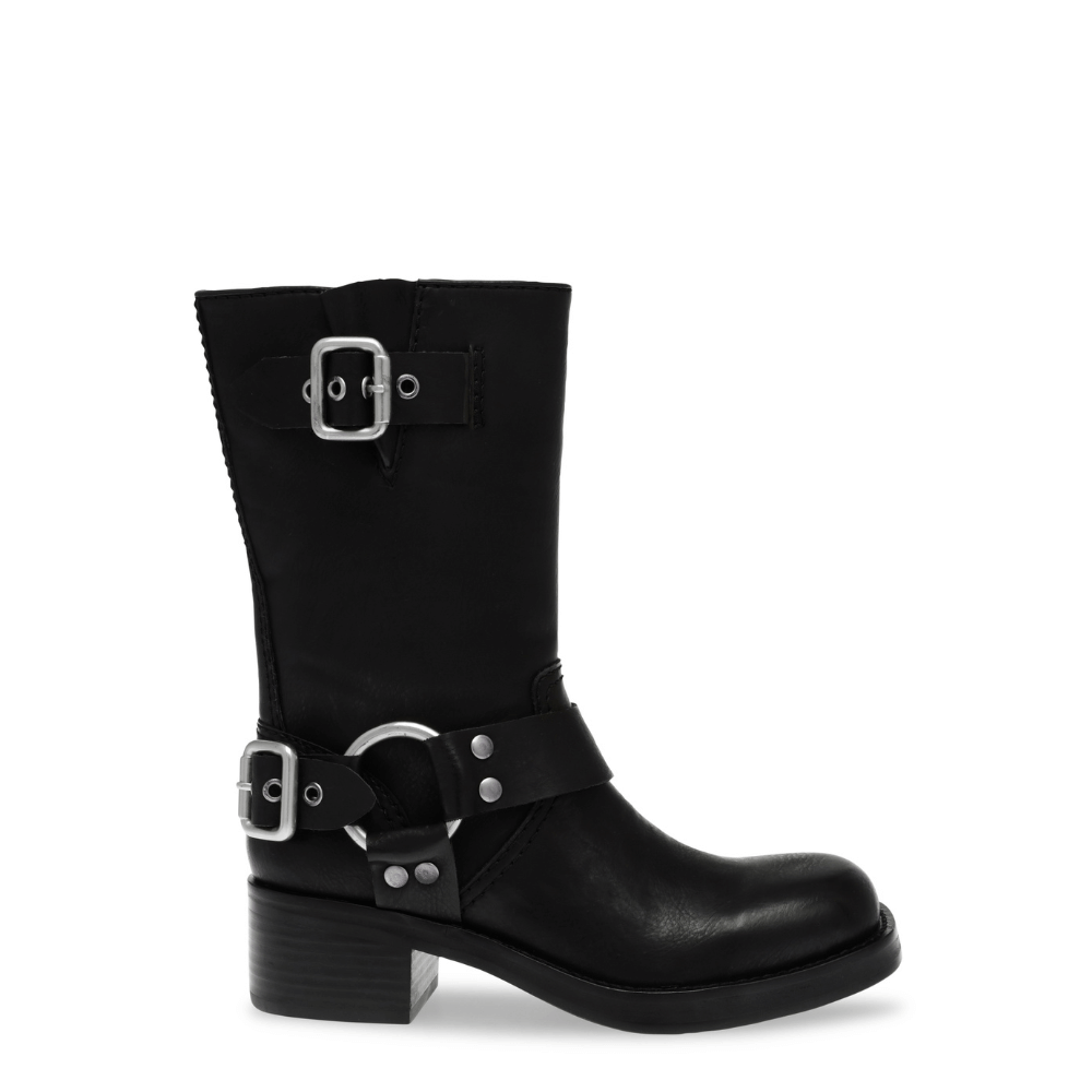 Un biker realizzato nero con fibbie e borchie in argento satinato. Un iconico modello riproposto da Steve Madden ideale nella stagione invernale da abbinare a maxi vestiti in maglia o caldi piumini over. Il gambale è 21 cm. La tomaia è in similpelle