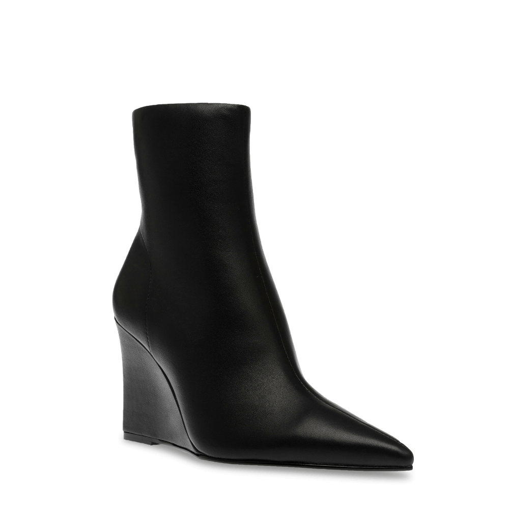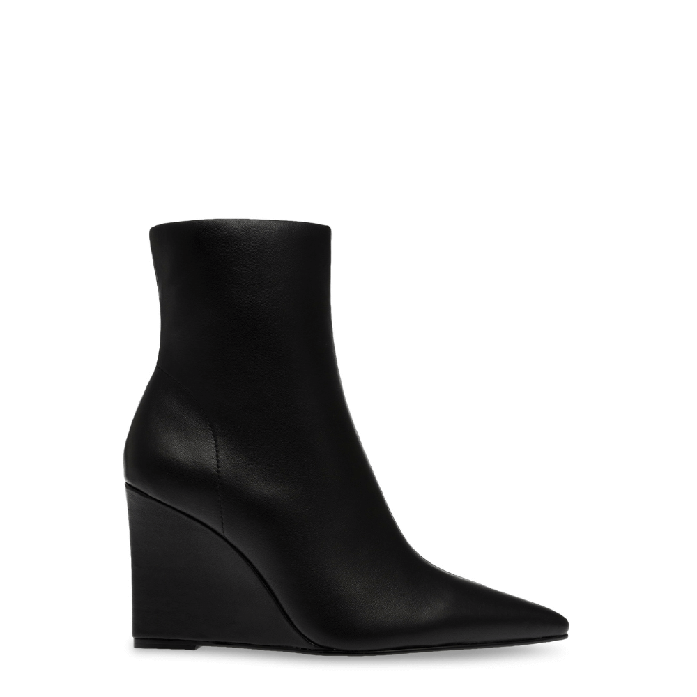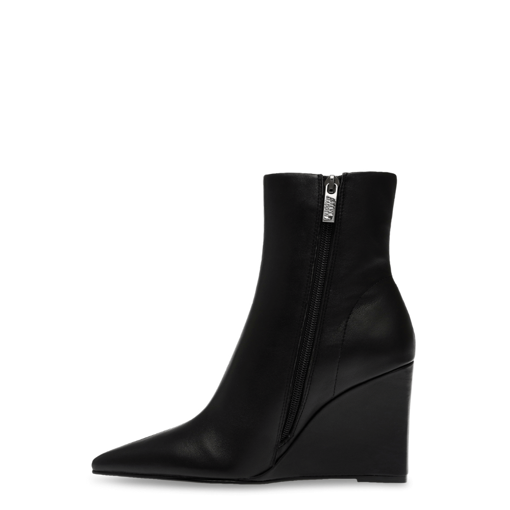 Steve Madden propone un tronchetto nero con una punta sfilata e una zeppa di 8 cm. Chiusura comoda con zip laterale - La tomaia e la fodera sono in similpelle come la suola che è in tunit