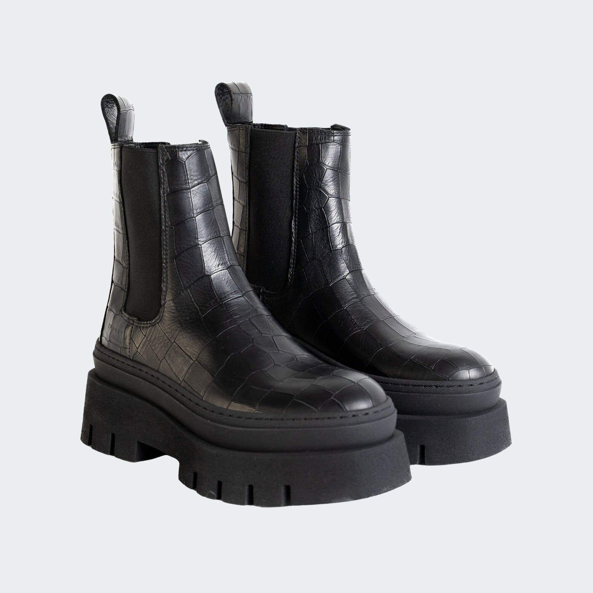 Il tronchetto Copenhagen cph 686 unisce stile e comfort grazie alla suola carrarmato chunky che assicura stabilità e resistenza. Realizzato in pelle effetto cocco nero, è arricchito da elastici laterali che facilitano la calzata. Perfetto per un look moderno e deciso nell'autunno/inverno 2025.