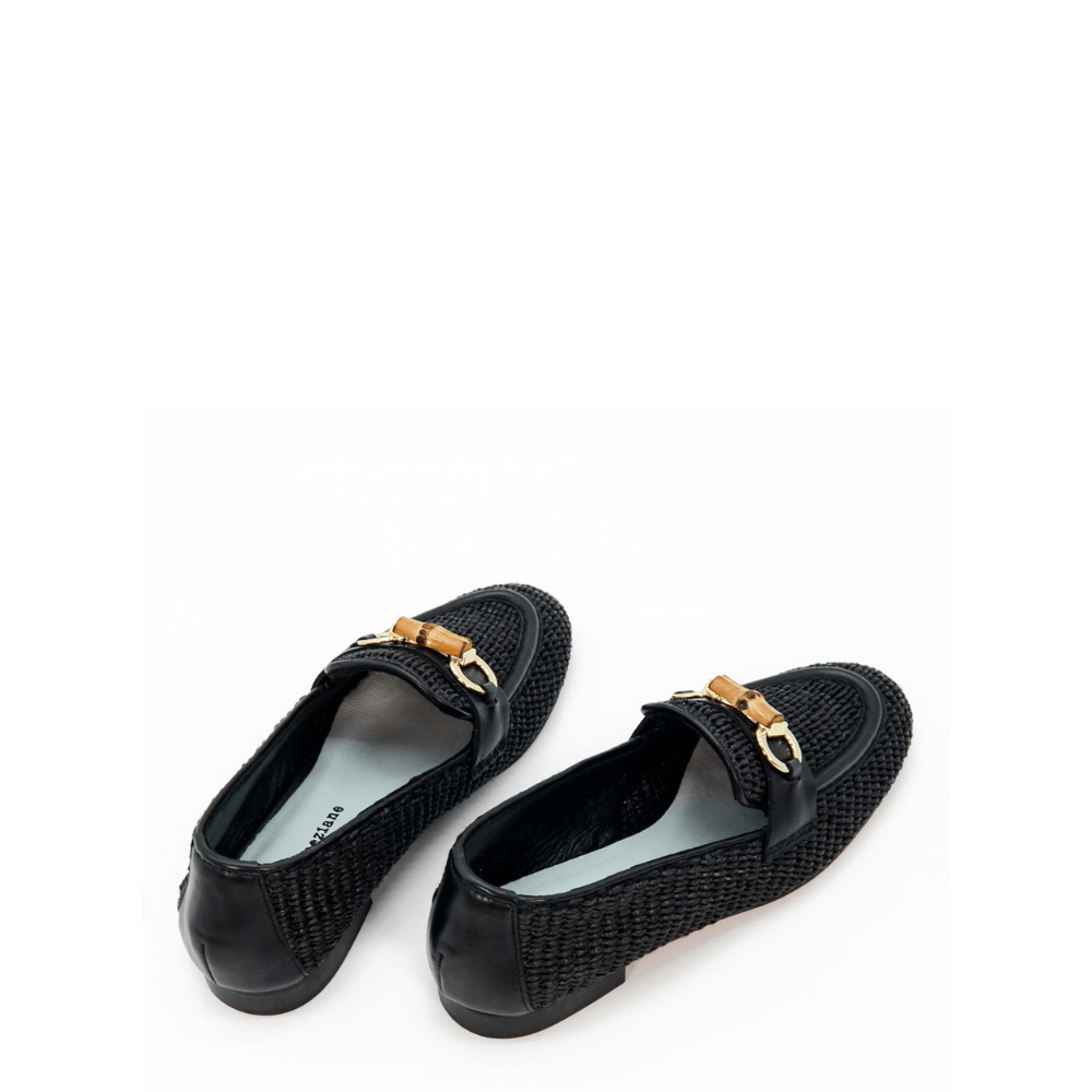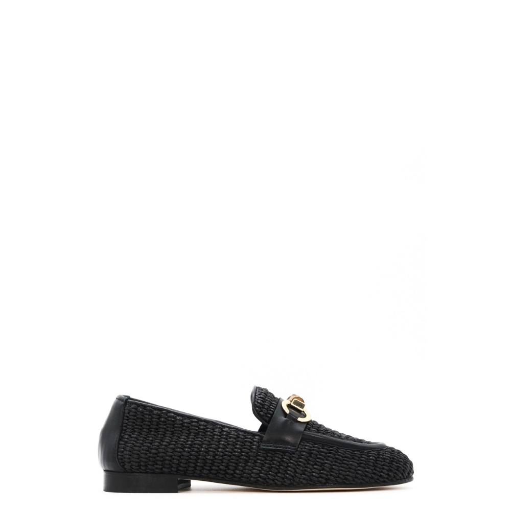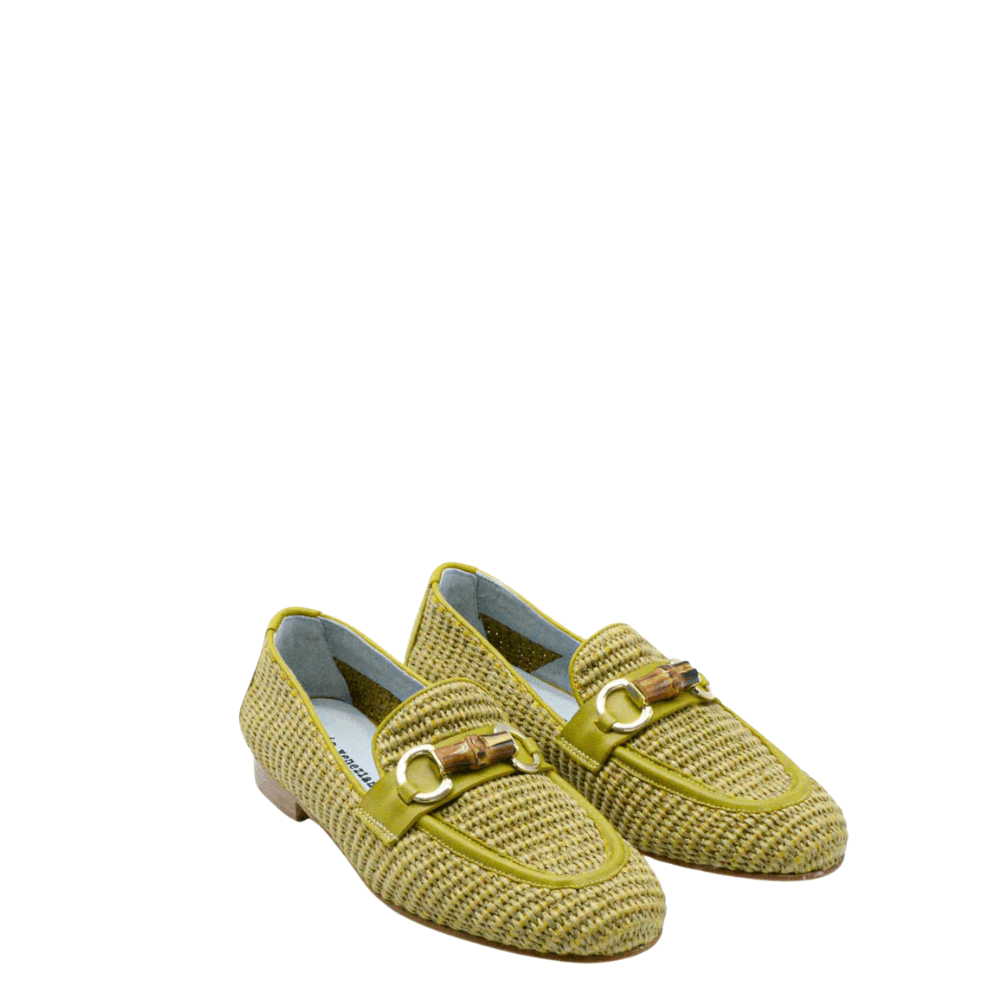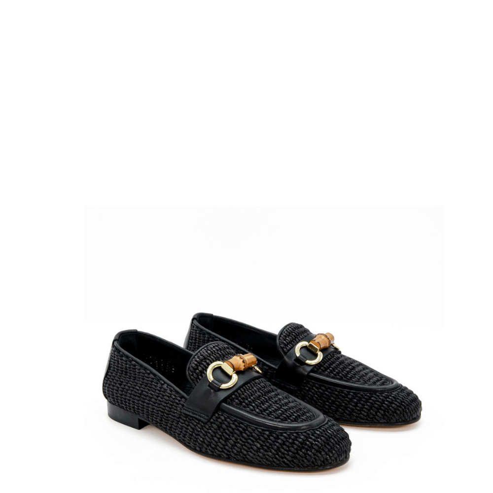 Mocassino donna in rafia intrecciata a mano, fodera in pelle, suoletta in pelle, suola in cuoio, morsetto in metallo e bambù. Disponibile in due varianti colore .